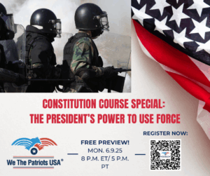 We are pleased to once again offer you a special free preview of our Constitution Course, ordinarily offered only as a benefit of a Patriot Silver (or above) membership. Join us Monday, June 9, 2025 at 8 p.m. ET / 5 p.m. PT for an interactive discussion regarding the contours of the Presidential power to use force when local officials refuse to keep the peace, or interfere with federal action. We will specifically discuss President Trump’s deployment of the National Guard to protect federal buildings and quell the riots in Los Angeles. As always, tonight’s class will be hosted by Constitutional scholar David Oldham of Constitutional Grounds.